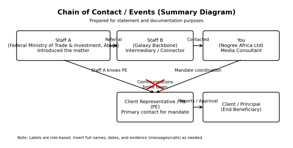 The consultancy claims it commenced work in good faith after being assured that funding would not be an issue, and proceeded to provide professional services including link documentation, strategic advisory, media outreach, and coordination of formal authorisation required for platform-based complaints.
